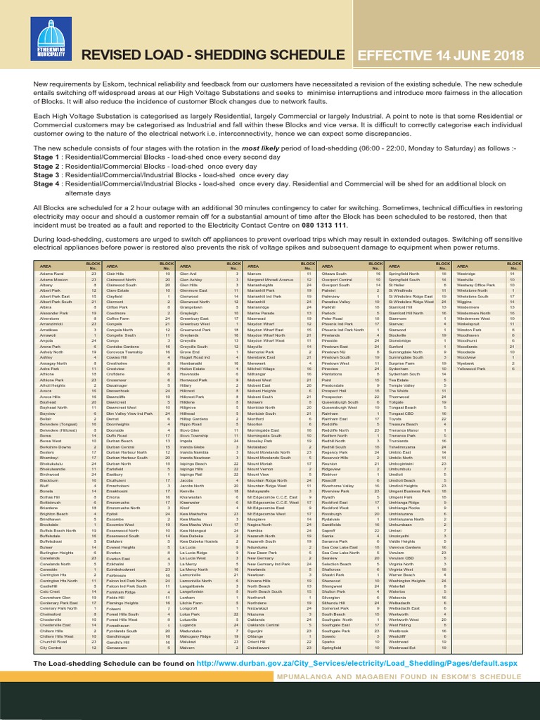 Loadshedding schedule durban 2021 : Make the script executable chmod +x load. This is according to eskom spokesperson sikonathi mantshantsha, who said the power utility was fixing units at its two power stations. Explore concerts, meetups, open mics, art shows, music events and a lot more. Eskom has announced plans to implement. The load shedding app allows you to: City customers are on stage 1. Load shedding will begin with the declaration from eskom. Load shedding has made an ominous return. The schedule comprises of stage 1, stage 2 and stage 3 emergencies, with stage 1 being largely residential and commercial load. Durban eskom load shedding schedule 2021 / loadshedding schedule 2021 / municipal loadshedding. * access the twitter feed of the ethekwini municipality here.be smart enough to plan your time efficiently!! Prices can vary, but right now we believe that flexibility matters.